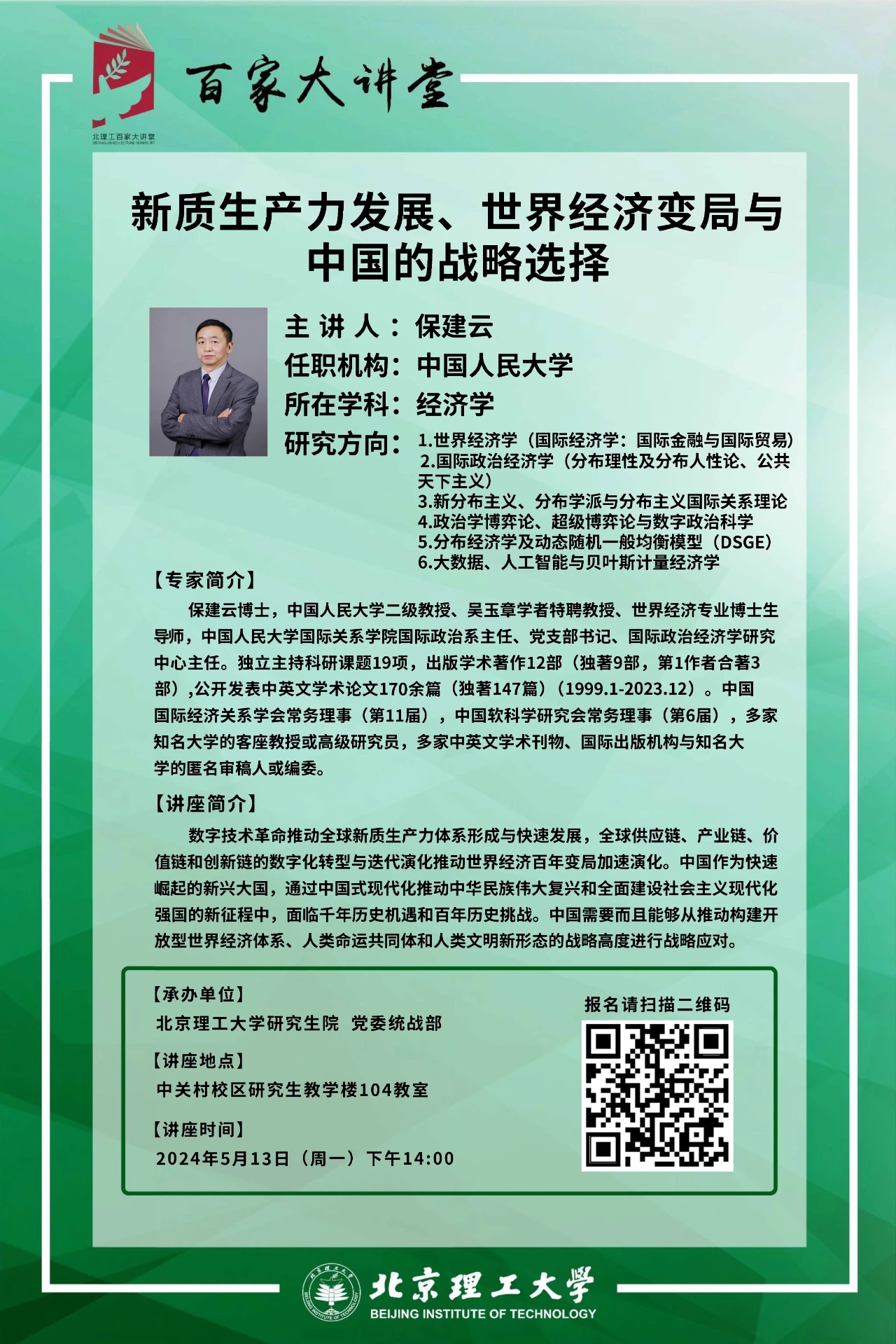【百家大讲堂】保建云教授作题为“新质生产力发展、世界经济变局与中国的战略选择”的讲座预告