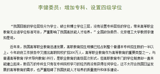 “我国目前的学位层级分为学士、硕士和博士学位三层,没有设置专科层级的学位,带来高等职业教育无合适学位标准可依,严重影响了我国高技能人才培养。”全国政协委员、北京理工大学教授李健如是说。