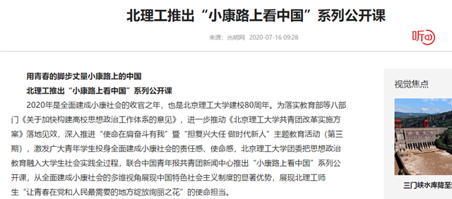 2020年是全面建成小康社会的收官之年,也是北京理工大学建校80周年。为落实教育部等八部门《关于加快构建高校思想政治工作体系的意见》,进一步推动《北京理工大学共青团改革实施方案》落地见效,深入推进“使命在肩奋斗有我”暨“担复兴大任 做时代新人”主题教育活动(第三期),激发广大青年学生投身全面建成小康社会的责任感、使命感,北京理工大学团委把思想政治教育融入大学生社会实践全过程,联合中国青年报共青团新闻中心推出“小康路上看中国”系列公开课,从全面建成小康社会的多维视角展现中国特色社会主义制度的显著优势,展现北理工师生“让青春在党和人民最需要的地方绽放绚丽之花”的使命担当。