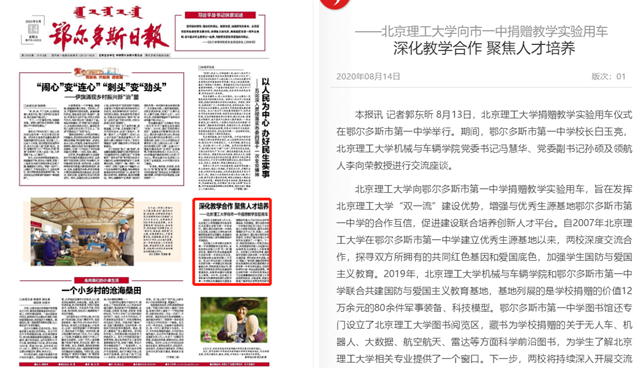 北京理工大学向鄂尔多斯市第一中学捐赠教学实验用车,旨在发挥北京理工大学“双一流”建设优势,增强与优秀生源基地鄂尔多斯市第一中学的合作互信,促进建设联合培养创新人才平台。自2007年北京理工大学在鄂尔多斯市第一中学建立优秀生源基地以来,两校深度交流合作,探寻双方所拥有的共同红色基因和爱国底色,加强学生国防与爱国主义教育。2019年,北京理工大学机械与车辆学院和鄂尔多斯市第一中学联合共建国防与爱国主义教育基地,基地列展的是学校捐赠的价值12万余元的80余件军事装备、科技模型。鄂尔多斯市第一中学图书馆还专门设立了北京理工大学图书阅览区,藏书为学校捐赠的关于无人车、机器人、大数据、航空航天、雷达等方面科学前沿图书,为学生了解北京理工大学相关专业提供了一个窗口。下一步,两校将持续深入开展交流合作,共同探索协同育人为祖国与社会培养拔尖创新型人才教育模式。北京理工大学知名学者、教授每年到鄂尔多斯市第一中学开展北理讲堂、学科前沿学术讲座,设立“领航人”李向荣、薛敏老师等学校优秀教师队伍将定期到鄂尔多斯市第一中学与学生座谈,交流学校学科介绍、学生生涯发展等。鄂尔多斯市第一中学的优秀学生还可以在寒暑期前往北京理工大学参观学校校区、实验室等,深度近距离了解学校办学特色和科研学科优势。