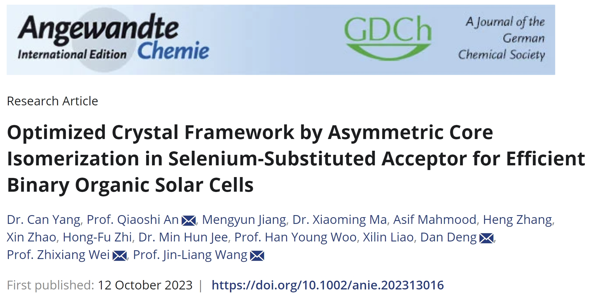 近期,北京理工大学化学与化工学院王金亮教授团队在新型硒取代位置异构化的小分子受体材料创制及其在高性能有机太阳能电池器件化应用方面取得重要进展。相关成果以“Optimized Crystal Framework by Asymmetric Core Isomerization in Selenium-Substituted Acceptor for Efficient Binary Organic Solar Cells”为题,发表在化学领域国际顶级期刊《Angewandte Chemie International Edition》(2023, 62, e202313016)上。北京理工大学化学与化工学院王金亮教授、安桥石特别研究员、国家纳米中心魏志祥研究员和邓丹研究员为共同通讯作者,北京理工大学为第一通讯单位,化学与化工学院博士研究生杨灿为该论文的第一作者。