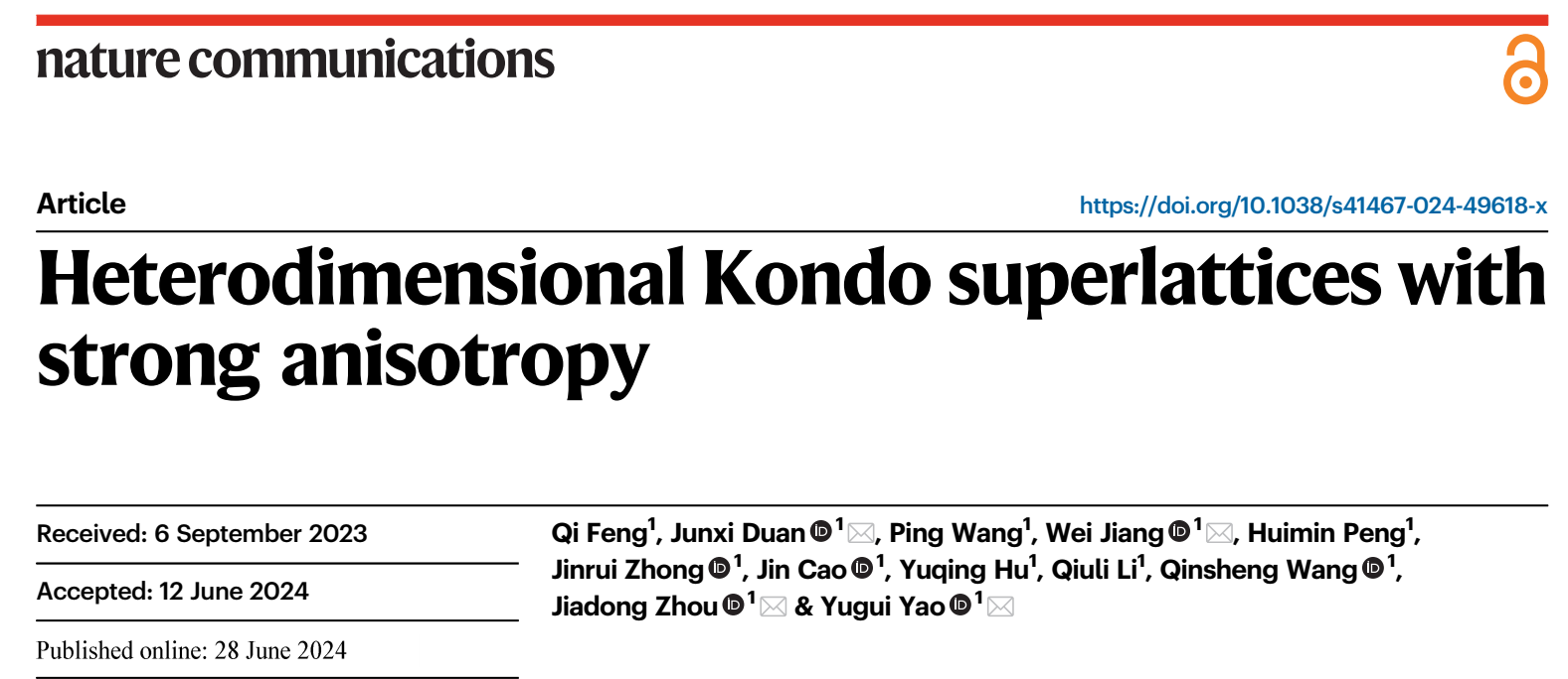 Qi Feng, Junxi Duan*, Ping Wang, Wei Jiang*, Huimin Peng, Jinrui Zhong, Jin Cao, Yuqing Hu, Qiuli Li, Qinsheng Wang, Jiadong Zhou* & Yugui Yao*, “Heterodimensional Kondo superlattices with strong anisotropy”, Nat. Commun. 15, 5491 (2024) (*为通讯作者)