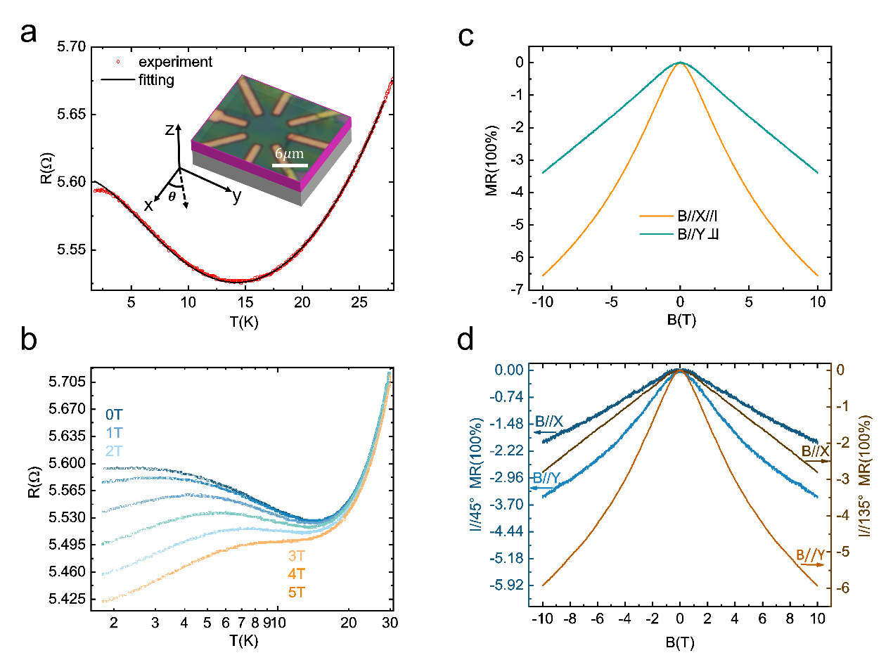 北京理工大学段俊熙副教授、姚裕贵教授团队长期致力于新型拓扑和量子材料的输运性质研究。为了实现这种异维近藤超晶格,研究团队选择了拥有丰富磁学性质的过渡金属二硫化物VS2- VS异维超晶格作为候选材料。该结构由北京理工大学的周家东教授最先合成[Nature 609, 46–51 (2022)]。研究中,我们发现:(1)在VS2- VS异维超晶格观察到了电阻关于温度的对数依赖关系以及负磁阻,即近藤效应的典型特征。有趣的是这两者对磁场的依赖关系表现出强烈的各向异性,如图1所示;(2)利用圆盘型器件,确定了各向异性的负磁阻来源于近藤效应的各向异性磁场依赖,如图2所示;(3)通过提取朗德g因子及居里温度,结合第一性原理计算,证实了近藤效应的各向异性磁场依赖来源于维度引起的各向异性磁性,如图3所示。