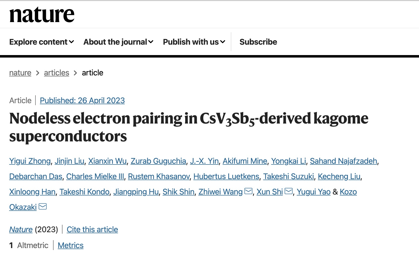 近日,北京理工大学物理学院姚裕贵教授、施训教授、王秩伟研究员团队,与东京大学钟益桂博士、Kozo Okazaki教授,中科院理论物理研究所吴贤新研究员,南方科技大学殷嘉鑫教授和瑞士保罗谢勒研究所Zurab Guguchia教授等人合作在《自然》杂志发表论文“Nodeless electron pairing in CsV3Sb5-derived kagome superconductors”,揭示了笼目超导体中稳健的无节点超导能隙,为研究其超导配对机理提供了关键实验依据。