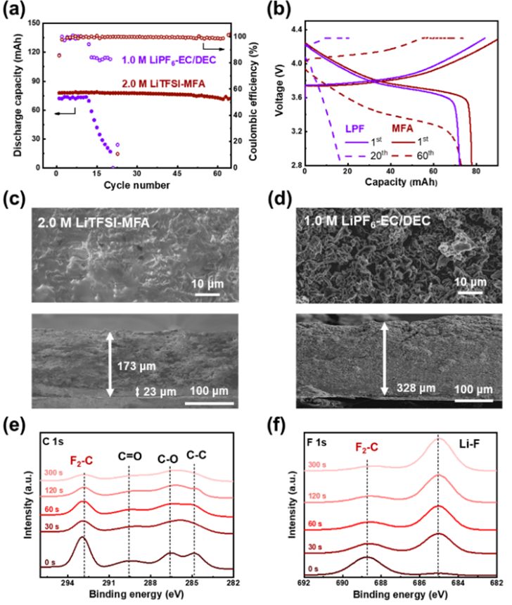 图4. MFA电解液在金属锂电池中的电化学性能。