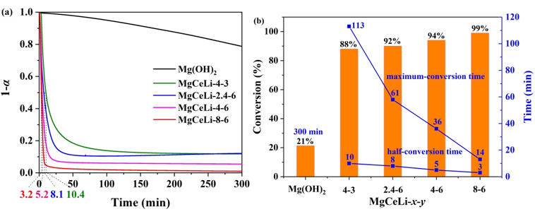 图1 (a)纯Mg(OH)2和MgCeLi-x-y复合材料在270℃下的等温动力学曲线;(b) 纯Mg(OH)2和MgCeLi-x-y复合材料在270℃下的最大转化率和转化时间的对比。