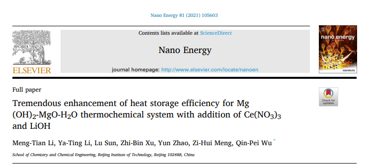近期,北京理工大学化学与化工学院武钦佩教授团队在储能科学技术领域取得阶段成果。研究成果以“Tremendous enhancement of heat-storage efficiency for Mg(OH)2-MgO-H2O thermochemical system with addition of Ce(NO3)3 and LiOH”为题,12月18日在线发表于 Nano Energy  (https:///doi.org/10.1016/j.nanoen. 2020.105603)。北京理工大学化学与化工学院研究生李梦甜和李亚婷为共同第一作者,北京理工大学是唯一作者单位。
