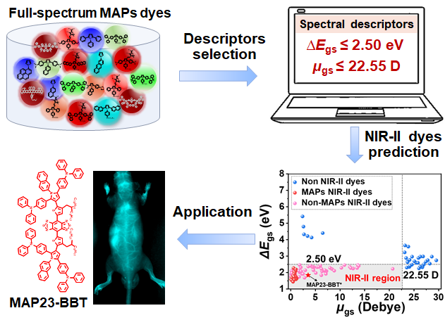 光学成像技术具有无创、灵敏度高和实时监测等优势,在肿瘤诊断与治疗领域越来越受到科学研究工作者的关注。尤其是NIR-II(1000~1700 nm)荧光染料,其具有更深的生物组织穿透深度、较低的生物组织吸收和散射、较小的自荧光干扰和更高的空间分辨率,有望为个性化智能医疗技术的发展夯实根基。然而,由于缺乏分子设计策略及其构效关系,NIR-II荧光染料的新结构发展缓慢。采用理论计算可以建立NIR-II染料分子结构、关键物理量和光谱之间的内在关系,提升NIR-II染料分子设计的效率,推动NIR-II染料新分子的开发与应用。化院的郑小燕团队基于对荧光染料组装结构与发光机制的研究积累( Aggregate ., 2024, 5(1), e415; J. Am. Chem. Soc. , 2023, 145 (18), 10092; Proc. Natl. Acad. Sci. U.S.A. , 2022, 119 (12), e2116543119; Angew. Chem. Int. Ed. , 2022, 61, e202213615),与材院的聚集诱导发光(AIE)研究团队的石建兵开展跨学科合作,以具有诊疗一体化应用潜力的多芳基吡咯(MAPs)( Dyes Pigm. 2023, 219, 111569; Biomaterials 2022, 283, 121409; Nanoscale 2022, 14, 14064-14072; Sci. China Chem. 2021, 64(9), 1530-1539; Chem. Eur. J. 2020, 26, 14947-14953; Mater. Chem. Front.  2019, 3, 2072-2076.)为原始计算模型设计了62个具有AIE特性的给体-受体型(D-A)分子。通过对这62个分子基态、激发态结构和吸收、发射光谱系统的理论计算,提出了刻画NIR-II染料的关键描述符和判定标准:∆ E gs和 μ gs的阈值分别为2.50 eV和22.55 D,即当∆ E gs ≤ 2.50 eV, μ gs ≤ 22.55 D时,分子的发射光谱可到达NIR-II区。