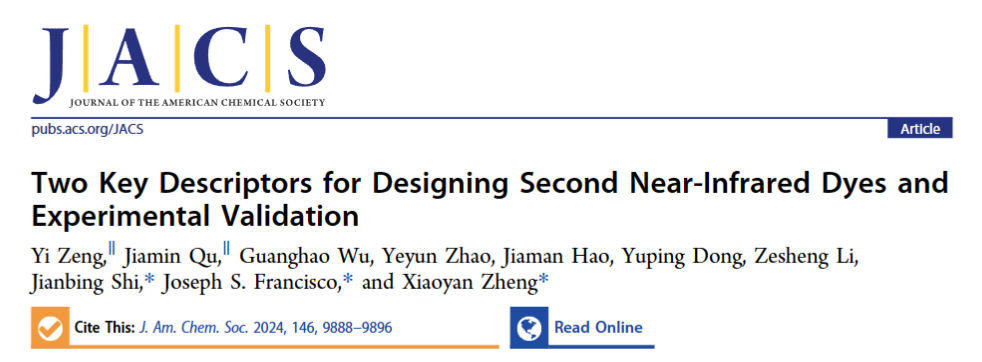 近日,北京理工大学化学与化工学院郑小燕副教授和材料学院石建兵副教授,与美国宾夕法尼亚大学Francisco教授合作,在近红外二区(NIR-II)荧光染料理论设计方面取得重要进展。相关成果以“Two key descriptors for designing second near-infrared dyes and experimental validation”为题发表于国际顶级期刊《Journal of the American Chemical Society》。北京理工大学为第一通讯单位,曾怡和屈佳敏两位博士生为共同第一作者,郑小燕、石建兵和Francisco教授为共同通讯作者,李泽生教授和董宇平教授对本工作给予了重要指导。