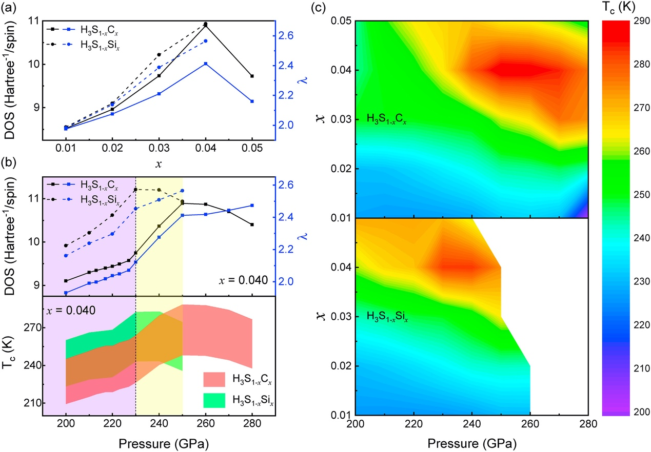 图2 (a) H3S1-xZx @250GPa (Z=""C,"" Si)的DOS和电声耦合常数。(b) H3S0.960Z0.040的DOS、电声耦合常数和超导相变温度。(c)超导相变温度分布图。