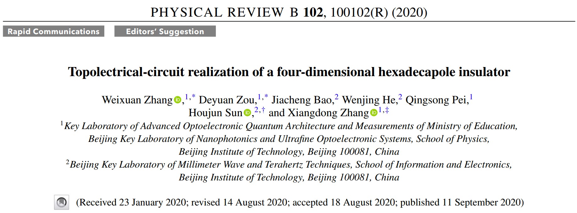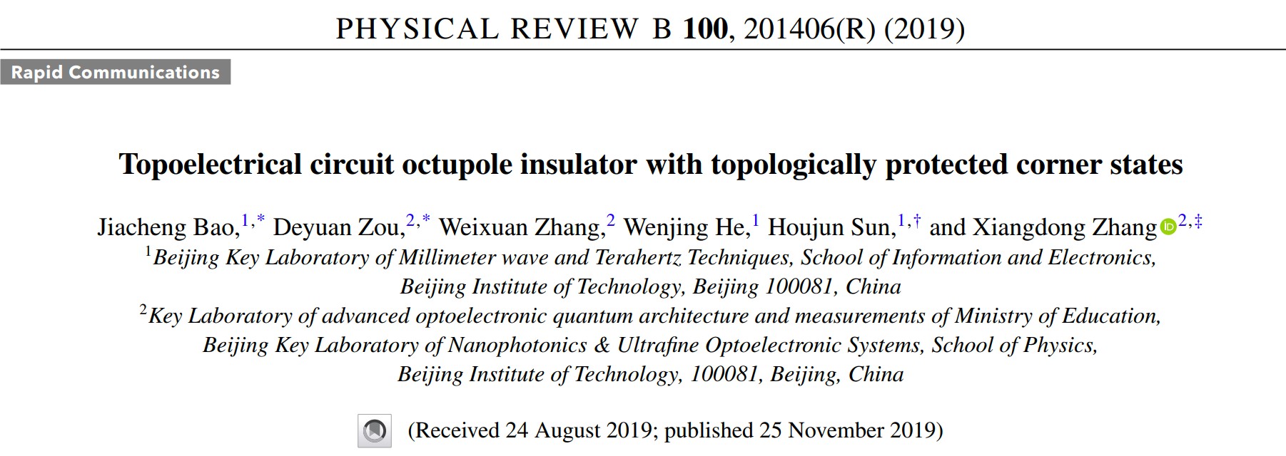 2019年11月,相关工作在Phys. Rev. B上以Rapid Communications的形式发表[Phys. Rev. B, 100 201406(R) (2019)]。北京理工大学信息与电子学院博士生包嘉诚和物理学院博士生邹德源为论文的共同第一作者。值得指出的是,在上述工作发表后,八极子拓扑绝缘体进一步在声学[Nat. Commun. 11 2108 (2020), Nat. Commun. 11 2442 (2020)]和电路系统[Light: Science & applications 9 145 (2020)]中进一步得到了验证。