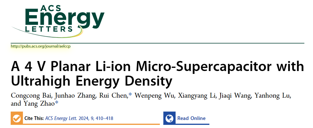 近日,北京理工大学化学与化工学院硕士生白聪聪第一作者身份在国际顶级期刊《ACS Energy Letters》(IF: 22)发表题目为“A 4 V Planar Li-ion Micro-Supercapacitor with Ultrahigh Energy Density”的研究论文(DOI:10.1021/acsenergylett.3c02406)。北京理工大学为论文第一通讯单位,北京理工大学化学与化工学院赵扬特别研究员和陈瑞博士后为共同通讯作者。