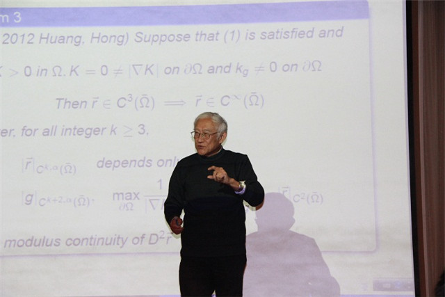 洪家兴院士报告的题目是“regularity of solutions to degenerate elliptic Monge-Ampere equations”。椭圆 Monge-Ampere 方程是偏微分方程研究领域的热点问题之一,许多国内外著名学者,包括丘成桐教授、Pogorelov教授、Spruck教授等都针对此类问题进行了大量的研究工作。但关于退化椭圆 Monge-Ampere 方程解的正则性, 这类问题比较困难,一般性结果也相对较少。洪院士首先介绍了部分学者的重要研究成果,然后介绍了近几年自己及其合作者在这一方向的最新研究进展,之后对部分结果的证明过程及所用的数学工具进行了简要的说明 。