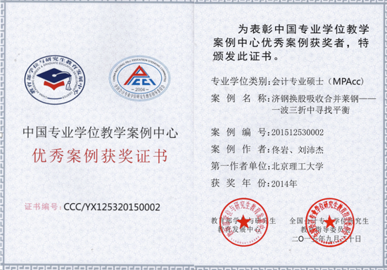 2014年度中国专业学位教学案例中心优秀案例中的全国MPAcc优秀教学案例评选日前揭晓并颁发证书,我院会计系佟岩副教授提交的案例《济钢换股吸收合并莱钢——一波三折中寻找平衡》入选。