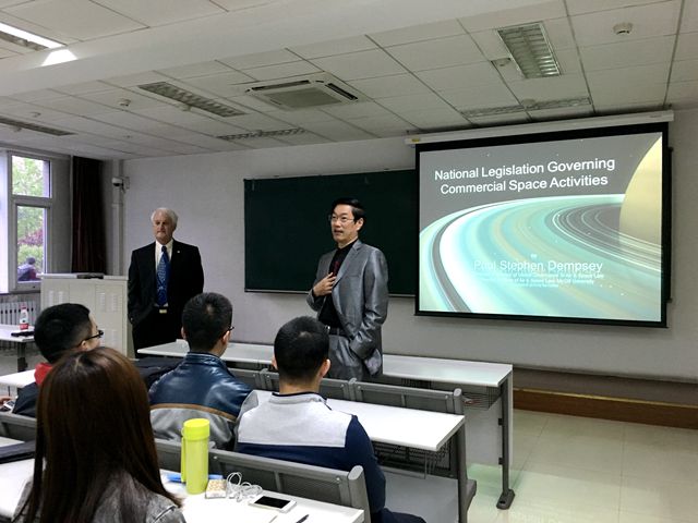 2016年4月14日18点30分,在北京理工大学研究生楼104室,Paul Stephen Dempsey教授为2014级和2015级国际法研究所的研究生带来了一场主题为“National Legislation Governing Commercial Space Activities”的精彩讲座。