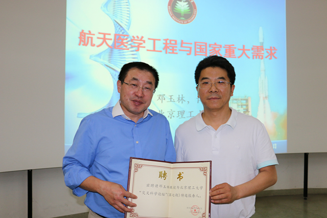 报告结束后,北京理工大学高层次人才发展中心副主任金海波教授为邓玉林教授颁发了“特邀报告人”聘书,并对邓教授带领团队研制的生命“小立方”成功搭载“天舟”表示祝贺。