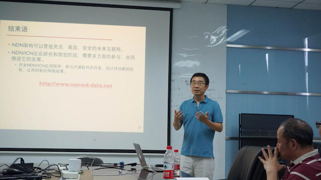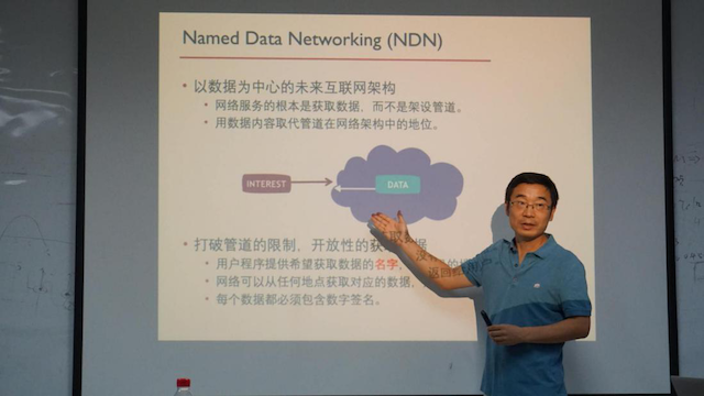 Beichuan Zhang副教授介绍了未来互联网的信息化发展趋势,分析了以数据为中心的未来互联网架构研究的重要意义与应用前景,并具体介绍了NDN研究团队目前主要研究方向,给出了以数据为中心的组网关键问题和解决方法。