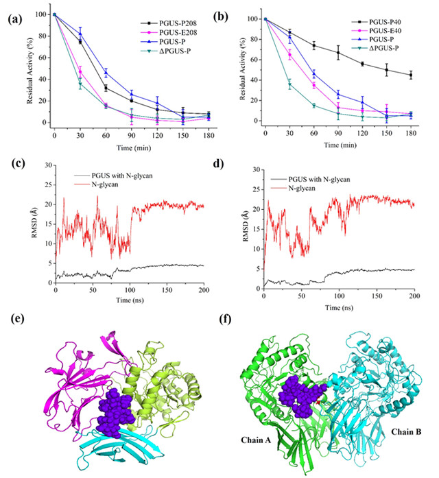 北京理工大学化学与化工学院李春教授课题组在前期完成晶体结构解析的真菌β-葡萄糖醛酸酶(PGUS,同源四聚体结构)为模型蛋白,并将其在毕赤酵母(能够在蛋白质的特定位点引入高甘露糖型糖链)中异源表达(PGUS-P),验证了蛋白质内源的Asn383和Asn594位点的糖基化对PGUS-P的稳定性有显著影响。通过计算机模拟与实验相结合的方法,揭示了PGUS-P的两个內源N-糖基功能类似于“连接臂”,能将空间上距离相近的超二级结构域相连,使得其局部结构更加紧凑,从而提高了蛋白质的整体稳定性(图1)。以此为启发,研究人员通过对PGUS的晶体结构分析,在超二级结构域、结构域、亚基界面间设计了N-糖基化位点,进一步提高了PGUS-P的动力学、热力学稳定性。酶学性质表征并结合全原子分子动力学模拟结果表明,在结构域界面间的Asn208位糖链和周围二个结构域产生的作用力,形成了“糖桥”构型,将蛋白质在70°C下的半衰期提高了2.7倍,去折叠自由能提高了8.4 kJ/mol;而在亚基界面间的Asn40位糖链通过和相邻亚基的作用,形成了“糖卡”构型,将热稳定性提高了7.1倍,去折叠自由能提高了14.6 kJ/mol,同时酶的催化效率也提高了1.7倍(图2)。