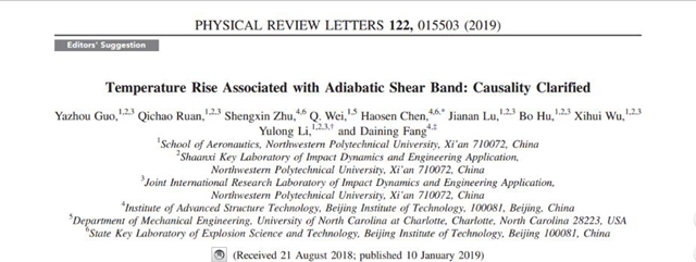2019年1月11日,物理学顶级期刊《物理评论快报》(Physical Review Letters)在线报道了西北工业大学、北京理工大学(共同完成单位)联合研究成果。在方岱宁院士、李玉龙教授的指导下,郭亚洲副教授(第一作者)、陈浩森副教授(共同通讯作者)、朱盛鑫博士和阮启超硕士等开展了绝热剪切带的产生和温度之间的因果关系研究 (Temperature Rise Associated with Adiabatic Shear Band: Causality Clarified),这篇文章主编被选为“Editor’s Suggestion” 。