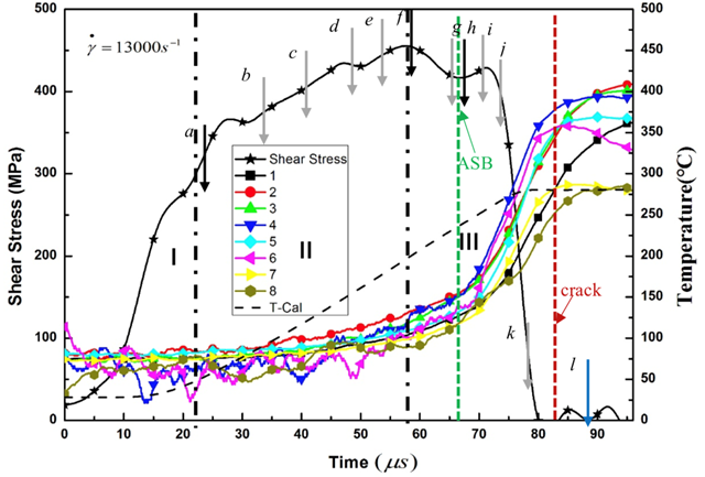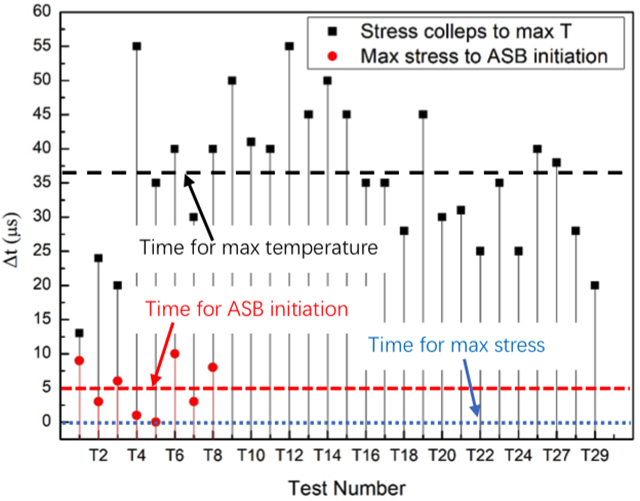 图4给出了绝热剪切局部化过程中典型事件发生时刻的相对关系。绝热剪切带的萌生时刻出现在最大应力时刻点之后。实验结果意味着基于热-塑性失稳的临界准则预测的临界剪切应变可能会偏小。绝热剪切带萌生时刻的温度大约50-90˚C,导致的应力下降30-54MPa。同时,变形区域的温度分布表明材料没有出现局部化的热软化。此外,由于应变率硬化使得材料的应力增大了50-60MPa。因此,热软化效应不足以促使应力的陡降或绝热剪切带的萌生。当绝热剪切带萌生后的30µs,温度达到最大值。温度的快速上升可以认为是绝热剪切带形成和传播导致的。同时,通过分析高速相机获得变形过程,可以知道绝热剪切带完全传播到整个试样的时间小于10µs。因此,更大局部变形促进绝热剪切带的发展,更带来了局部更高的温度。如将绝热剪切局部化过程中的典型事件按照时间先后排序:应力峰值-绝热剪切带萌生-绝热剪切带传播/温度上升-最大温度/宏观裂纹。绝热剪切带萌生后的温度上升意味着温升不是触发绝热剪切带形成的原因,而是绝热剪切局部化导致了温度的上升。传统的绝热剪切带热软化机理应该需要被重新认识。
