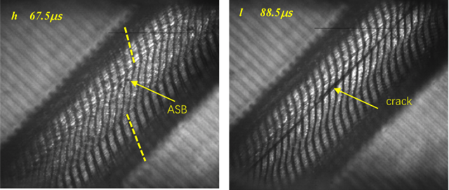 在冲击载荷下,绝热剪切带被认为是材料失效的重要机理之一。自从Zener和Hollomon提出绝热剪切局部过程是一种热-塑性失稳后,许多研究者认为绝热剪切带是由于材料热软化与应变/应变率硬化之间的竞争导致的。此外,剪切带内的材料再结晶表明绝热剪切带形成伴随着温度上升。因此,目前大部分学者认为温度上升是导致绝热剪切带形成的主要因素。然而,这一普遍接受的认识还未得到实验验证,主要由于两方面难题亟待解决:一是绝热剪切对测温仪器提出“两高一宽”的要求,即高时间分辨(微秒级)、高空间分辨(十微米级)、宽测温区间(近千度);另一方面,需要搭建微秒级同步红外测温和光学测变形的实验平台,才能揭示绝热剪切带形成和温度升高两者之间的因果关系。