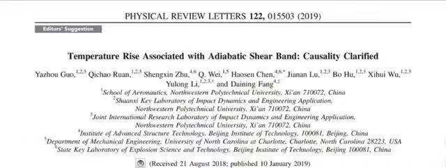 日前,物理学顶级期刊《物理评论快报》(Physical Review Letters)在线报道了西北工业大学、北京理工大学(共同完成单位)联合研究成果。在方岱宁院士、李玉龙教授的指导下,郭亚洲副教授(第一作者)、陈浩森副教授(共同通讯作者)、朱盛鑫博士和阮启超硕士等开展了绝热剪切带的产生和温度之间的因果关系研究 (Temperature Rise Associated with Adiabatic Shear Band: Causality Clarified),这篇文章主编被选为“Editor’s Suggestion” 。