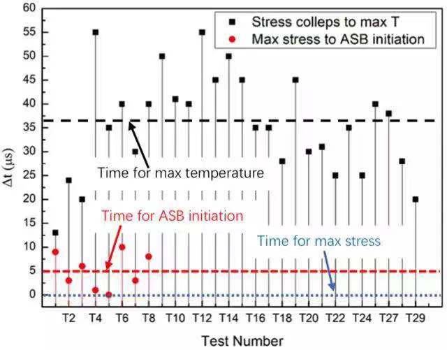 图4给出了绝热剪切局部化过程中典型事件发生时刻的相对关系。绝热剪切带的萌生时刻出现在最大应力时刻点之后。实验结果意味着基于热-塑性失稳的临界准则预测的临界剪切应变可能会偏小。绝热剪切带萌生时刻的温度大约50-90˚C,导致的应力下降30-54MPa。同时,变形区域的温度分布表明材料没有出现局部化的热软化。此外,由于应变率硬化使得材料的应力增大了50-60MPa。因此,热软化效应不足以促使应力的陡降或绝热剪切带的萌生。当绝热剪切带萌生后的30µs,温度达到最大值。温度的快速上升可以认为是绝热剪切带形成和传播导致的。同时,通过分析高速相机获得变形过程,可以知道绝热剪切带完全传播到整个试样的时间小于10µs。因此,更大局部变形促进绝热剪切带的发展,更带来了局部更高的温度。如将绝热剪切局部化过程中的典型事件按照时间先后排序:应力峰值-绝热剪切带萌生-绝热剪切带传播/温度上升-最大温度/宏观裂纹。绝热剪切带萌生后的温度上升意味着温升不是触发绝热剪切带形成的原因,而是绝热剪切局部化导致了温度的上升。传统的绝热剪切带热软化机理应该需要被重新认识。
