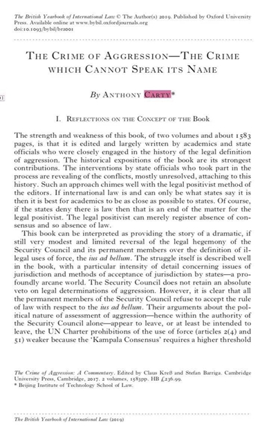 在英国国际法年刊上发表的The Crime of Aggression –The Crime which Cannot Speak its Name一文分析了将侵略罪引入《国际刑事法院规约》的法律意义。文章认为,安理会常任理事国拒绝接受编纂该法律的做法是明智的,否则会违背《联合国宪章》禁止使用武力规则。Carty认为,国际社会有必要重新考虑国际法的基础,从而克服各国间彼此感到的巨大焦虑和不安。要维护世界和平,需要各国人民重新发现并对正义、相互尊重和相互理解达成共识。