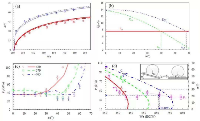 作为吸引人同时也是难理解的流体力学现象,前人针对液滴飞溅的研究主要集中于垂直撞击,而自然界和一系列工程应用中的大部分撞击都是倾斜的,液滴撞击倾斜表面引起非对称飞溅并最终抑制飞溅的机理尚未被理解。论文通过在真空室中开展液滴倾斜撞击实验,研究了液滴在不同环境压力下撞击倾斜表面的飞溅现象(如图1所示),获得了一系列条件下抑制液滴飞溅所需的临界条件(如图2中的符号所示),通过对撞击过程的机理分析,建立了一个理论模型,模型计算结果可以很好地吻合一系列条件下的实验结果(如图2中的曲线所示)。上述结果清楚地解释了液滴在倾斜表面形成非对称飞溅的机理,同时,实验研究和理论分析均表明液滴撞击后形成的液膜前端速度决定了液滴是否发生飞溅,这为液滴飞溅机理的进一步研究提供了新的思路和方向。