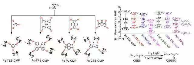 水污染等环境问题是当今社会面临的一大挑战,通过光催化反应对污染物进行高级氧化降解有望成为一种更加高效、节能的污染物处理方法。王博、冯霄团队通过三键聚合反应构筑了系列基于二茂铁基元的共轭微孔聚合物(Fc-CMPs)用于有毒有害物质降解研究。Fc-CMPs具有较大的孔径和比表面积,使得污染物容易进入孔道进行预富集并可充分接近易发生氧化还原反应的内表面,同时Fc-CMPs合适的分子轨道能级使得这类材料可高效产生活性氧物种。在可见光和模拟太阳光下,Fc-CMPs光催化降解亚甲蓝的能力均优于二氧化钛 (P25),并且能够将化学战剂芥子气模拟物(2-氯乙基乙基硫醚)完全转化为无毒产物。该研究工作发表在《德国应用化学》上(Angew. Chem. Int. Ed. , 2019, DOI: 10.1002/anie.201813598),文章第一作者为博士生马丽,通讯作者为王博和冯霄。