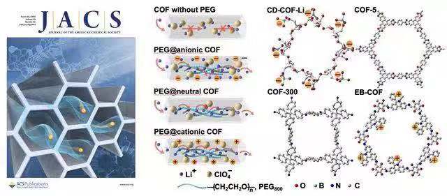 在前期工作中( Angew. Chem. Int. Ed., 2017, 56 , 16313,第一作者为博士生张媛媛,通讯作者为冯霄),该团队曾成功开发出基于环糊精的三维共价有机骨架材料(CD-COFs),该系列COFs为首次利用柔性基元构筑的具有 rra 拓扑学结构并通过离子型硼元素连接的三维COFs材料。其中,CD-COF-LiÉLiPF6-EC-DMC的室温锂离子电导率可以达到2.7 mS/cm。然而,其中残留的微量电解液可能会在实际应用过程中带来一定的安全隐患。为解决这一问题,该团队将低分子量聚乙二醇(PEG)装载入COF孔道中加速锂离子传导,制备出没有溶剂残留的全固态电解质,并系统性研究了COF骨架电荷对于锂离子传导行为的影响,实现大于0.6的锂离子迁移数以及120 °C 下1.8 mS/cm的离子传导速率。这一简单的通过担载PEG加速离子传导并提高工作温度范围的策略为将多孔材料进一步应用于全固态电池领域提供了可能。该研究工作发表在《美国化学会志》上,并被选为封面文章( J. Am. Chem. Soc. , 2019, 141, 1923),文章第一作者为硕士生郭振彬和博士生张媛媛,通讯作者为王博和冯霄。