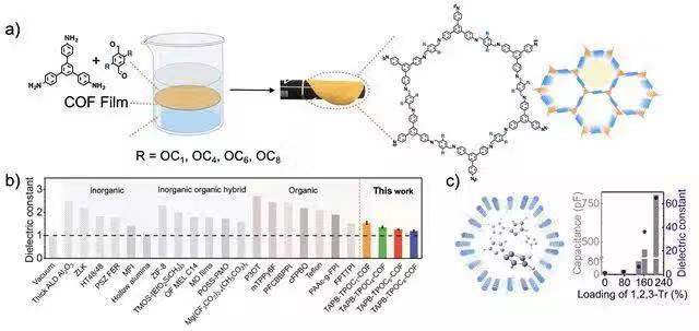 有机多孔材料大多不溶不熔,为其进一步器件化等实际应用带来了巨大挑战。该团队在前期大量成膜化研究基础上,成功利用液液界面成膜法开发了具有不同长度烷氧基链修饰的系列COF薄膜材料,并对其介电常数等相关性质进行了研究。该系列柔性的COF膜具有接近于空气的介电常数值(在105 Hz下, κ = 1.19 ± 0.04),可媲美目前已报道的无机多孔材料,并且这类COF薄膜材料表现出较好的机械性能、低介电损耗、高击穿电压、低漏电流、高抗湿度和抗弯折能力。低介电常数材料被广泛应用于电子电路器件中的绝缘层,用于减少信号延迟、串扰噪声和能量耗散。除此之外,高介电常数材料可以应用于场效应晶体管的栅极和电容器当中,该团队还利用COF薄膜装载小分子极性化合物,可将其介电常数提升43倍。该研究工作发表在《德国应用化学》上( Angew. Chem. Int. Ed. , 2018, 57, 16501),文章第一作者为博士生邵鹏鹏、李婕,通讯作者为王博和冯霄。