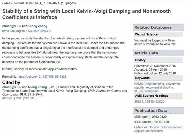 日前,北京理工大学数学与统计学院张琼副教授与美国明尼苏达大学Zhuangyi Liu教授合作在国际顶级学术期刊《SIAM Journal of Control and Optimization》上发表了题为“Stability of a string with local Kelvin–Voigt damping and nonsmooth coefficient at interface”和“Stability and regularity of solution to the Timoshenko beam equation with local Kelvin-Voigt damping”的研究论文。这两篇论文分别分析了具局部分布的Kelvin–Voigt扰动的弦系统和Timoshenko梁系统的稳定性与正则性。