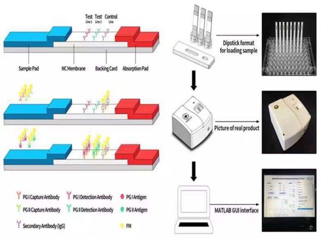 胃癌的早期诊断和治疗是胃癌防治的重要手段,可以提高存活率并对预后防控提供有效的指导,所以应在胃癌高发地区大力推广早癌筛查工作。胃蛋白酶原(PG)属于胃粘膜分泌的特定蛋白酶组,可分为两大类:胃蛋白酶原I(PG I)和胃蛋白酶原II(PG II)。PG的分泌水平反映了胃粘膜的形态和功能状态,被在同样是胃癌高发地区的日本和韩国作为胃癌筛查的生物标志物应用于全国范围性的筛查工作。然而,目前用于检测PG I和PG II的方法耗时耗力,且需要专业的实验室环境配备,不适用于我国的胃癌大规模筛查,亟需一种可以实现快速且灵敏的PG I和PG II同时检测方法,为大规模胃癌筛查提供可行方案。
