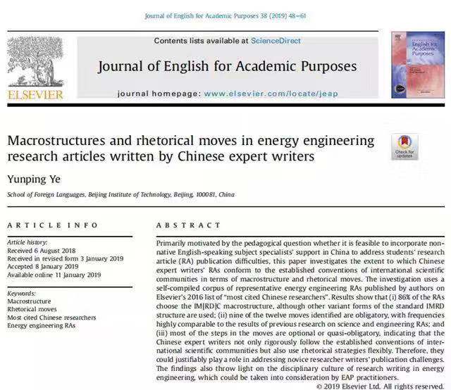 北京理工大学外国语学院叶云屏教授对70多名高被引“中国能源专家科研论文宏观结构和修辞语步”的研究论文于2019年在《学术英语期刊》(Journal of English for Academic Purposes)第38卷发表,填补了国际语言学界对该领域科研论文研究的空白以及对中国专家学术写作特征研究的空白,为国内外学术写作教学实践提供了重要启示。