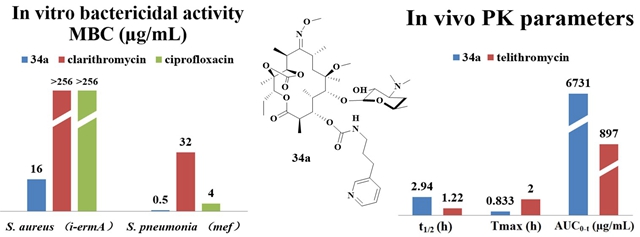 近期,该团队又报道了柔性侧链,即丙基氨基甲酰基,作用与同一靶点,丰富了抗耐药菌结构的多样性。优选的化合物具有良好的杀菌活性,提示可能存在不同于传统作用于核糖体的新型抗菌机制,同时体内药代动力学研究显示其半衰期长,血药浓度高,远优于临床对比药物泰利霉素。该文章最近发表于药物化学顶级期刊European Journal of Medicinal Chemistry, 2019, 171, 235-254。第一作者是在读硕士研究生李雪萌。(文章链接: https://www.sciencedirect.com/science/article/pii/S0223523419302557 )