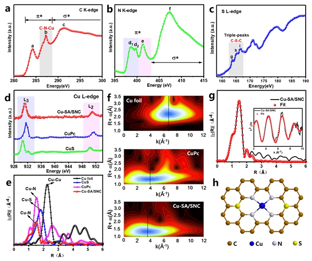 氧还原反应(ORR)中催化活性的调节对金属-空气电池和其他相关能量转换材料的开发具有重要意义。金属嵌入杂原子掺杂碳基催化剂由于其高电导率和可调节的电子结构,作为有希望的ORR催化剂引起了越来越多的关注。纳米界面工程由于电荷转移和化学键的强协同作用,被认为是修改碳基复合材料ORR性能的有效途径。陈文星等提出了一种原子界面策略来构建显著提高ORR活性的单原子Cu催化剂,其中Cu原子锚定在硫和氮改性的碳载体(Cu-SA / SNC)上。该催化剂在碱性介质中具有优异的ORR性能(E1/2= 0.893 V vs. RHE),远优于同类催化剂。此外,基于同步辐射的X射线吸收精细结构(XAFS)研究以及密度泛函理论(DFT)计算表明,孤立的键长收缩的低价Cu (+1)-N4-C8S2原子界面部分为ORR过程的活性位点,原子界面处的Cu和载体产生协同作用,通过调节中间吸附的反应自由能,有效提高ORR效率。该原子界面概念可以为先进的氧电极材料的合理设计提供新的方法,并为提高其催化性能提供新的可能性。