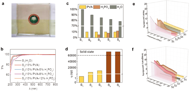 本研究团队首次基于第二类光学透明导体,离子导体为极化以及损耗介质,采用水溶性聚乙烯醇作为吸波材料,研究水相聚乙烯醇基凝胶的微波吸收机理表明高极性水分子在介质损耗方面对电磁波的衰减起着至关重要的作用(如图1所示)。同时,加入具有羟基官能团和磷酸分子的聚乙烯醇聚合物,使水分子以交联氢键网络的形式具有一定的流动性。当温度降低到零度以下时,聚乙烯醇水溶液中的凝胶会变成多晶,从而形成具有散射光波能力的不透明凝胶。这种光学特性因为水溶性聚乙烯醇基凝胶具有温度依赖的结晶变换能力而发生改变。对复介电常数的研究表明液态和固态相的聚乙烯醇基凝胶极性分子对电磁波有不同的敏感度,其中液态相对于电磁波更加敏感从而产生更多的介电损耗,而半固体凝胶相因为具有更多牢固的氢键网络结构,在电磁场中极化程度会被抑制,实现电磁参数的调控。