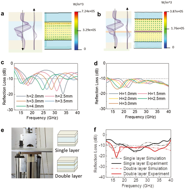 图2 基于光学可切换透明凝胶的300 X 300 mm2多层结构设计与弓形法实测:基于最优凝胶采用(a)单层凝胶与(b)双层凝胶设计多层结构的功率损耗密度分布;(c)采用单层凝胶与(d)采用双层凝胶的多层隐身结构优化;(e)弓形法实测多层透光隐身结构;(f) 仿真设计结果与弓形法实测结果对比。