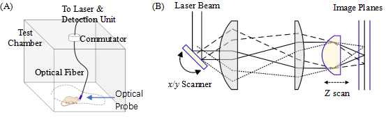 图1. (A) 光学成像中的可自由活动的小动物,微型光纤探头固定于其头部。(b)微型探头内部的三维扫描光路。