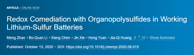 论文详情:Meng Zhao, Bo-Quan Li, Xiang Chen, Jin Xie, Hong Yuan, Jia-Qi Huang*. Redox comediation with organopolysulfides in working lithium-sulfur batteries, Chem 2020, 10.1016/j.chempr.2020.09.015.
