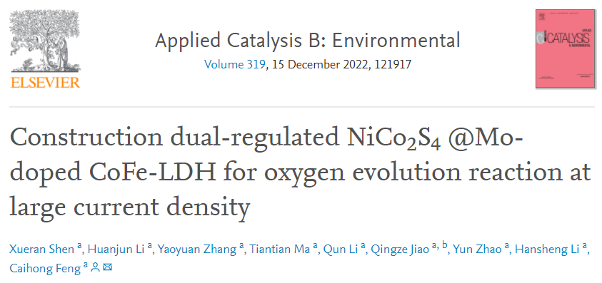 近日,北京理工大学化学与化工学院冯彩虹副教授团队在电解水制氢体系阳极析氧反应催化剂材料调控方面取得重要研究进展,相关成果以“Construction dual-regulated NiCo2S4@Mo-doped CoFe-LDH for oxygen evolution reaction at large current density”为题发表在化学类顶级国际期刊《Applied Catalysis B: Environmental》(影响因子24.319)。本文的通讯作者为北京理工大学冯彩虹副教授,第一作者为北京理工大学化学与化工学院专业学位硕士申雪然(现为该学院工程博士研究生),该博士生研究方向为工业化大电流电解水催化材料。