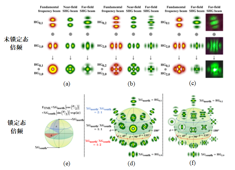 研究工作创新性的探索了谐振腔内横模锁定结构光束的二次谐波产生现象,通过理论仿真与实验验证为大家介绍了横模锁定结构光束的频率变换效果,并呈现了众多前所未见的绿光结构光束。图1是倍频光生成的理论分析及仿真,证明了横模锁定光束与未锁定光束的非线性频率变换后谐波光强分布具有明显区别,且可以据此判断基频光的模式锁定状态。