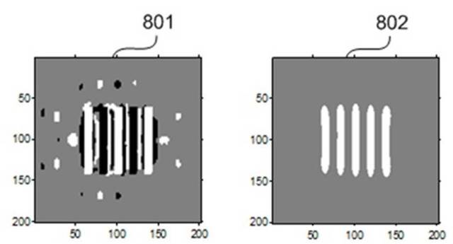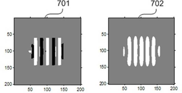 下面三图分别为未优化掩模、采用标量成像模型优化后的相移掩模、采用该课题组自主研发的Abbe矢量成像模型优化后的相移掩模,以及它们对应的光刻胶中成像。