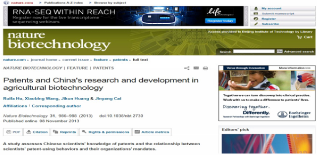胡瑞法教授在Nature Biotechnology上发表的文章的信息