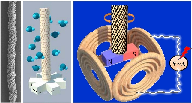 图示:螺旋石墨烯纤维在湿度改变下带动磁铁旋转产生电能