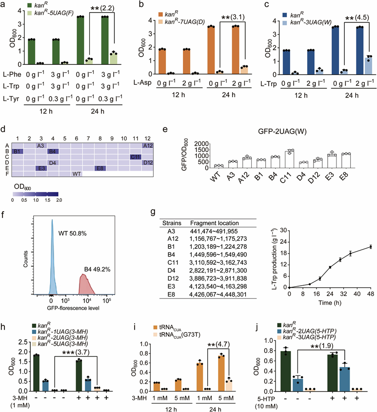 基于上述原理,本团队提出了一种基于人造tRNACUA的氨基酸高产菌株筛选策略。作为概念验证,通过基于生长和/或荧光激活细胞分选(FACS)的筛选,分别从大肠杆菌和谷氨酸棒状杆菌的随机突变库中筛选出L-色氨酸、L-苯丙氨酸和L-天冬氨酸等五种氨基酸的高产菌株,并构建了L-半胱氨酸,L-赖氨酸,L-甘氨酸和L-谷氨酸以及两种非蛋白质氨基酸(5-羟基色氨酸和3-甲基-组氨酸)的选择系统。为了进一步降低筛选标记的设计难度和提高本策略的通用性,在氯霉素抗性基因 cm 的5′末端添加了一段富含UAG的Tag序列,建立了一种改进的筛选标记。这种标记基因可以适用于对所有氨基酸高产菌株的筛选,并且可以通过简单的PCR法改变UAG的数量,来调节筛选强度的大小。随后,还证明了该策略可以被推广至大肠杆菌MG1655,XL10-gold,C321.∆A和谷氨酸棒状杆菌。