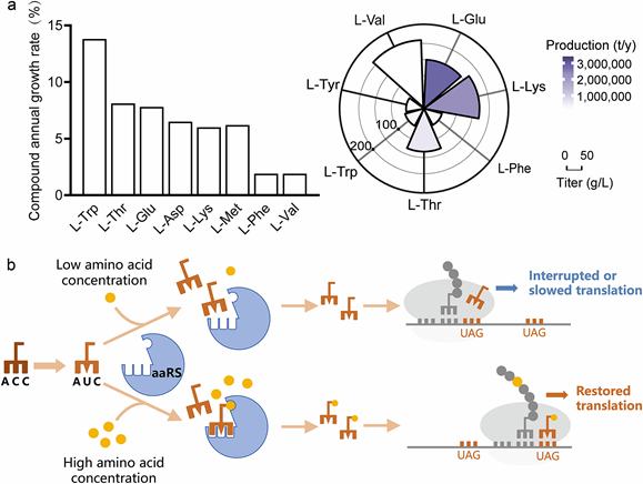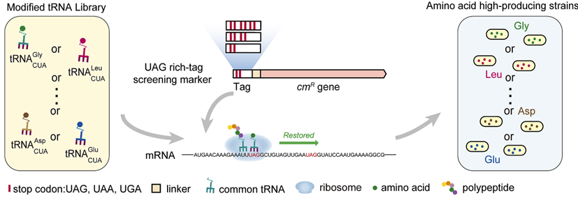 氨酰化是一种两步多底物反应,其速率不仅取决于两种主要底物tRNA和氨基酸的浓度,还取决于它们各自与氨酰化合酶(aaRS)的亲和力。抑制这些因素中的任何一个都会破坏氨酰化过程,而促进其他因素应该可以补偿这种负面影响。基于这一原理,可以根据目标氨基酸,使用与aaRS或aaRS-aa亲和力降低的tRNA,筛选目标氨基酸的高产菌株。其中,改造tRNA的反密码子是一种通用且简便的降低其与aaRS亲和力的方法。而在所有64个密码子中,琥珀密码子UAG通常不编码氨基酸,将tRNA的反密码子更改为UAG互补三联体(CUA)提供了一种通用的解决方案,既可以降低tRNA与同源aaRS的亲和力,又可以防止干扰其他氨基酸的正常翻译。