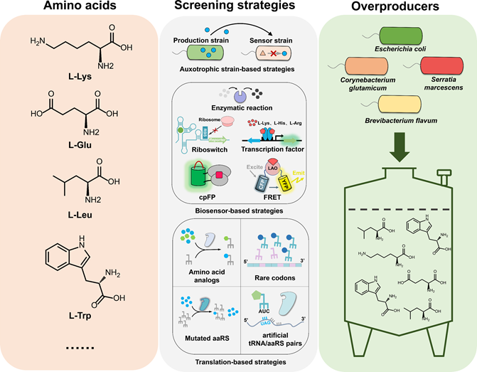 氨基酸已被广泛应用于食品、动物饲料、制药和化妆品行业。到2026年,全球氨基酸市场价值预计将达到296亿美元,复合年增长率(CAGR)为6-8%。微生物发酵是氨基酸生产的主要方法,占全球氨基酸产量的80%。而发酵的关键是获得高性能的发酵菌株。目前,氨基酸高产菌株的选育主要依靠构建突变库和后续筛选,突变库的建立方法已经较为成熟,而筛选策略往往决定了是否可以获得理想的氨基酸高产菌株。