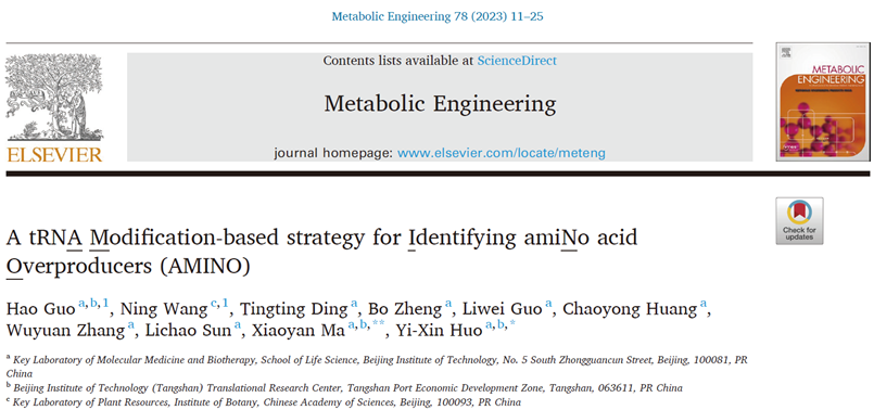 近日,北京理工大学霍毅欣教授团队在氨基酸高产菌株的筛选策略方面取得重要进展。相关成果以“A tRNA Modification-based strategy for Identifying amiNo acid Overproducers (AMINO)”为题,在顶级期刊《Metabolic Engineering》(影响因子:8.829)上发表(doi.org/10.1016/j.ymben.2023.04.012)。该工作以北京理工大学为第一通讯单位,霍毅欣教授和马晓焉特别副研究员为共同通讯作者,已出站博士后郭昊及王宁博士为共同第一作者。